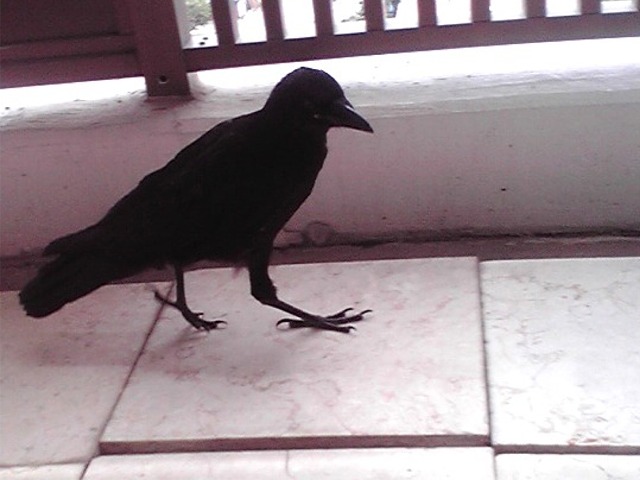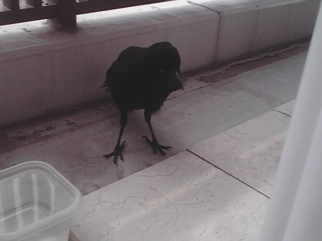 ベランダを見ると、カラスが。目があっても逃げない。