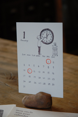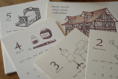 2010年・モノンクルカレンダーが出来ました。 つくってくれたのは かわうらあゆみさん。 モノンクルにある古道具たちをテーマに描いてくださいました。 古道具をスケッチするのに何度も何度もお店に通って、 モノンクルの建物スケッチも難しくて何度も書き直して、 消しゴムもたくさん使って、使って・・・ そして、できあがりました。 はがきサイズのカレンダーです。 かわいらしいカレンダーです。 13枚で一部となっております。一部800円です。 かわうらさんのテラコッタでつくったカードホルダーも 1個300円でございます。 お店に置いてございます。 発送もいたします。定形郵便物で80円。 どうぞよろしくお願いいたします。 1月はモノンクルの入口にある大きな学校時計と定番の丸椅子を。 2月は鍵、3月はトルソーと人気のプライチェア。インク瓶や万年筆、蛇腹のカメラ! どれもみなモノンクルにある道具たちなのです。 靴の木型をテラコッタでつくって、カードホルダーにしました。 「星めぐりの歌」の展示会の時にも置いていたものです。 小さくてかわいいです。
